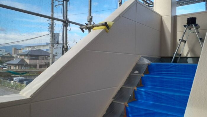 昨日の投稿にも記載しましたが、集合住宅では上の階に行くほど暑さが増すとの事ですので、少しでも暑さ軽減という願いもあり遮熱塗料を使用しています