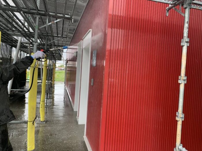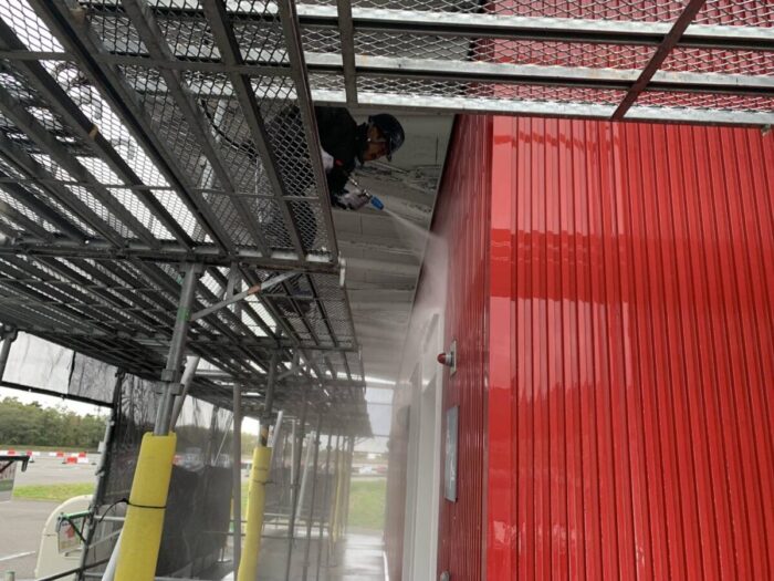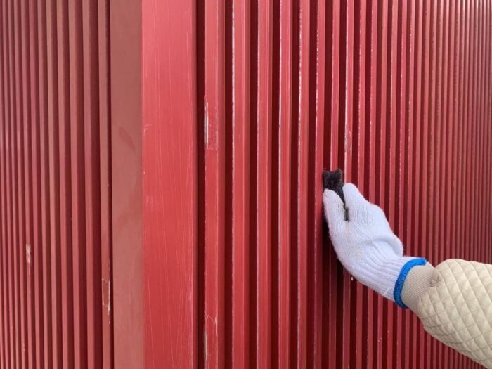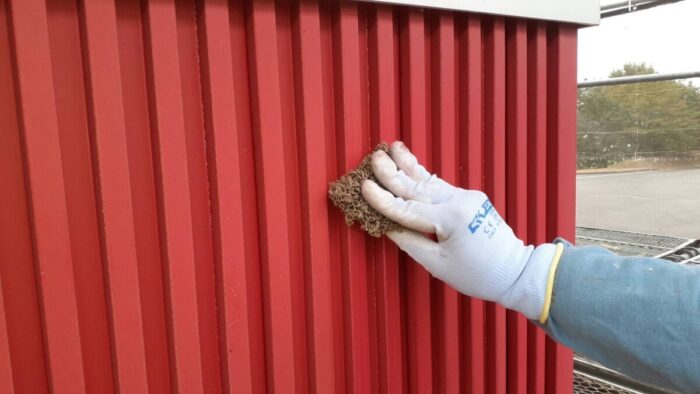 外壁のトタンも塗装前に全体的に足付け(傷付け)をして塗料の密着を良くします
