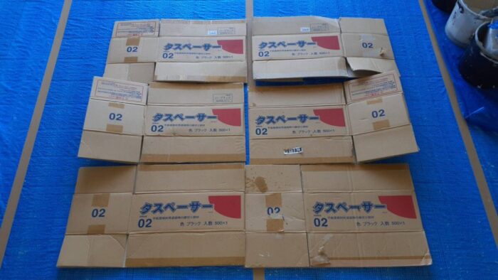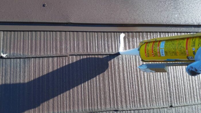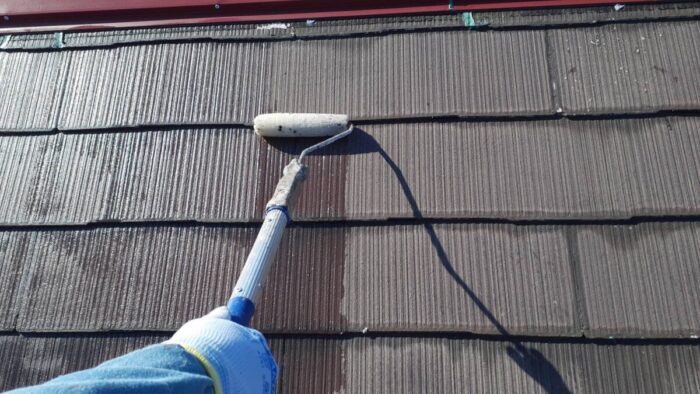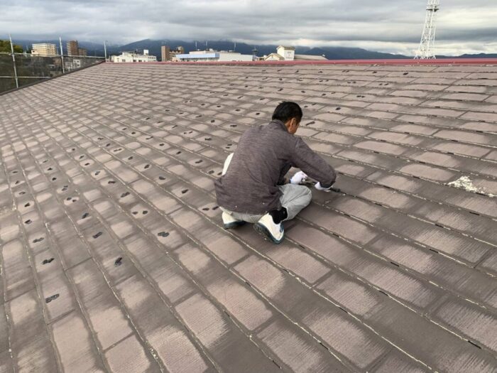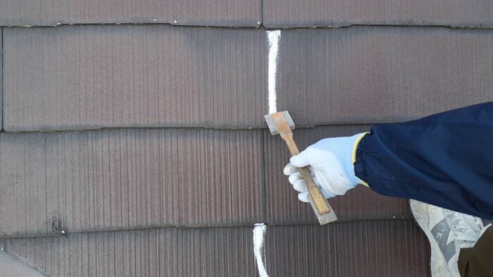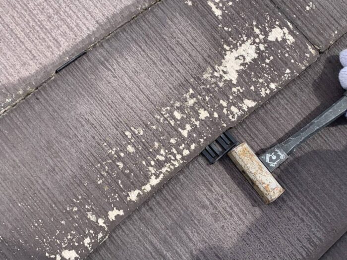 屋根の塗装前のカラーベスト材に雨漏れ防止材「タスペーサー」を差し込みました