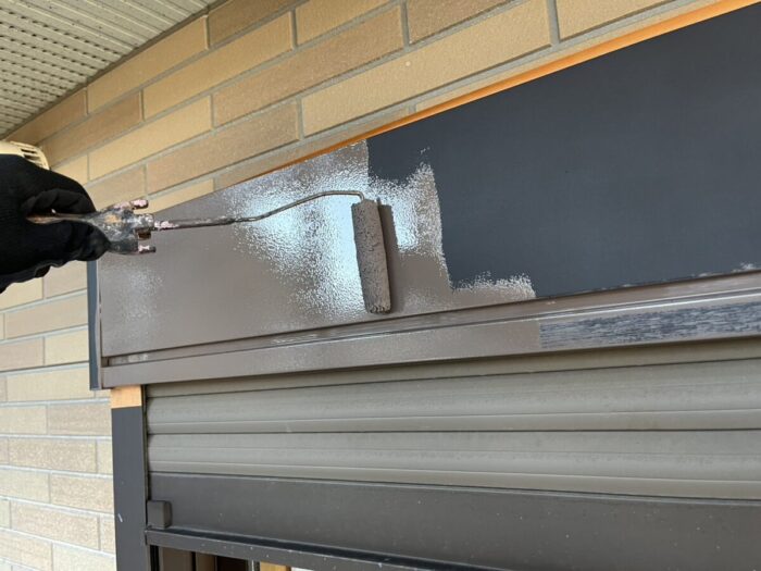 破風板、雨樋、シャッターBOX等の付帯部の中塗りをしました
