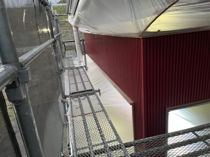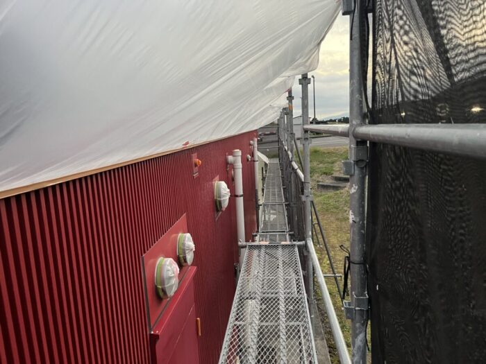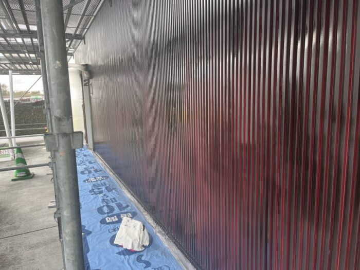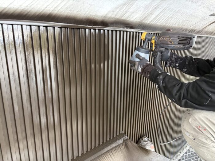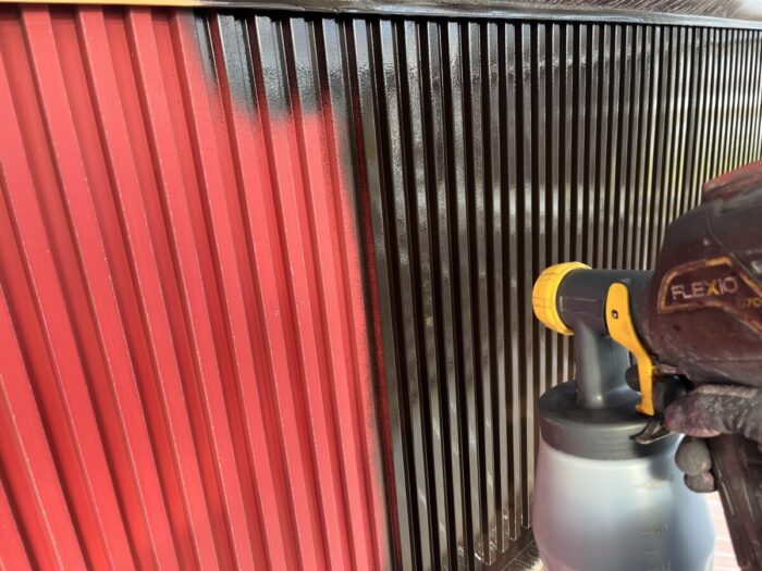 外壁の凹凸トタン部の塗装は、刷毛とローラーを使用するのが一般的ですが、今回は温風低圧吹付け塗装機で吹付け塗装を行います