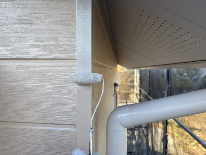 外壁のコーナー部分が色替えになるので、ミニローラーで丁寧に塗り変えていきます