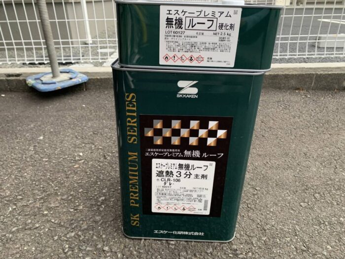 使用エスケー化研製品の「プレミアム無機ルーフ遮熱」の3分艶有を使用します